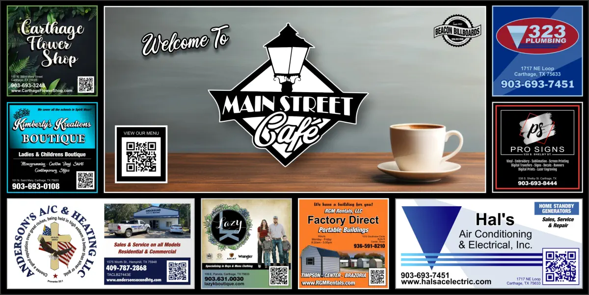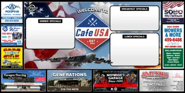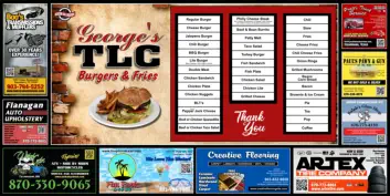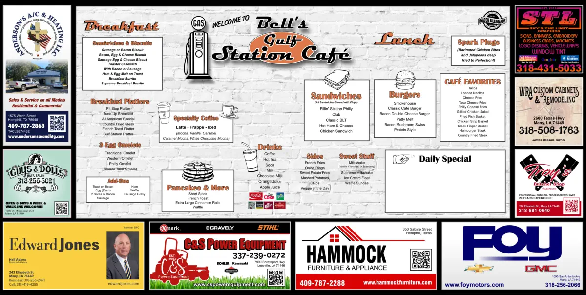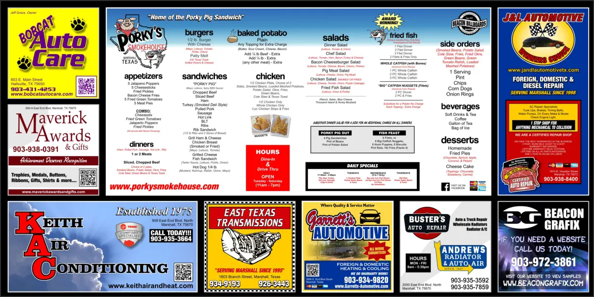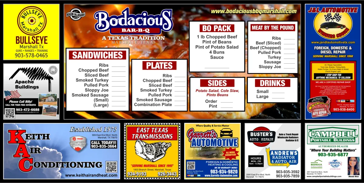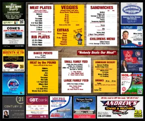 One of our specialty products is the Beacon Billboards. This product is usually located in local restaurants where local people patronize on a regular basis. The Beacon Billboard is an eye catcher because of its unique design and layout. Featured in the center of the Beacon Billboard is all about the restaurant or establishment that the board is located. The featured restaurant location has a vibrant full colored advertisement designed with luster and appeal.The surrounding perimeter of this area is lined with local business advertisements all designed with vibrant full color ads promoting their services and products. The Beacon Billboard is placed in the location on an annual basis and duration of the local business advertisements is likewise. The Beacon Billboard brings a sense of community pride and promotes local patronization.